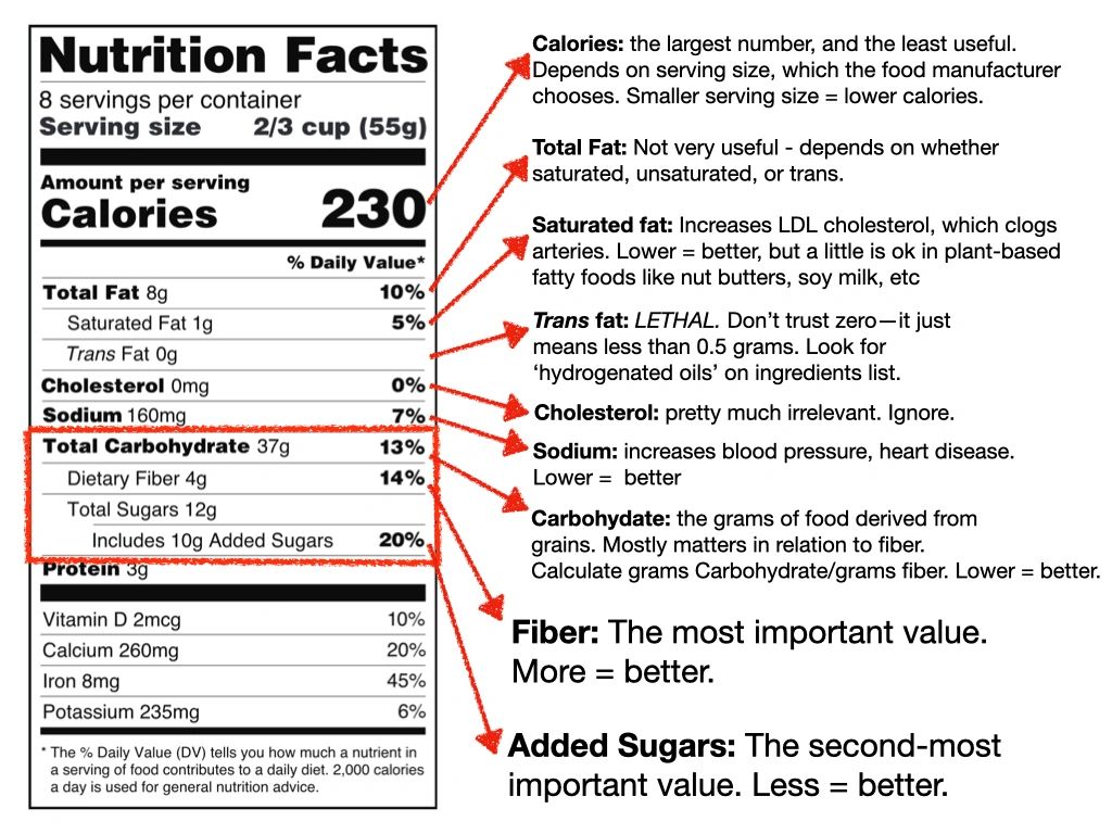When I look at a food label, my eyes go directly to three numbers: carbohydrate, fiber, and added sugars. Healthy food balances carbohydrates with lots of fiber, and don't have added sugars.